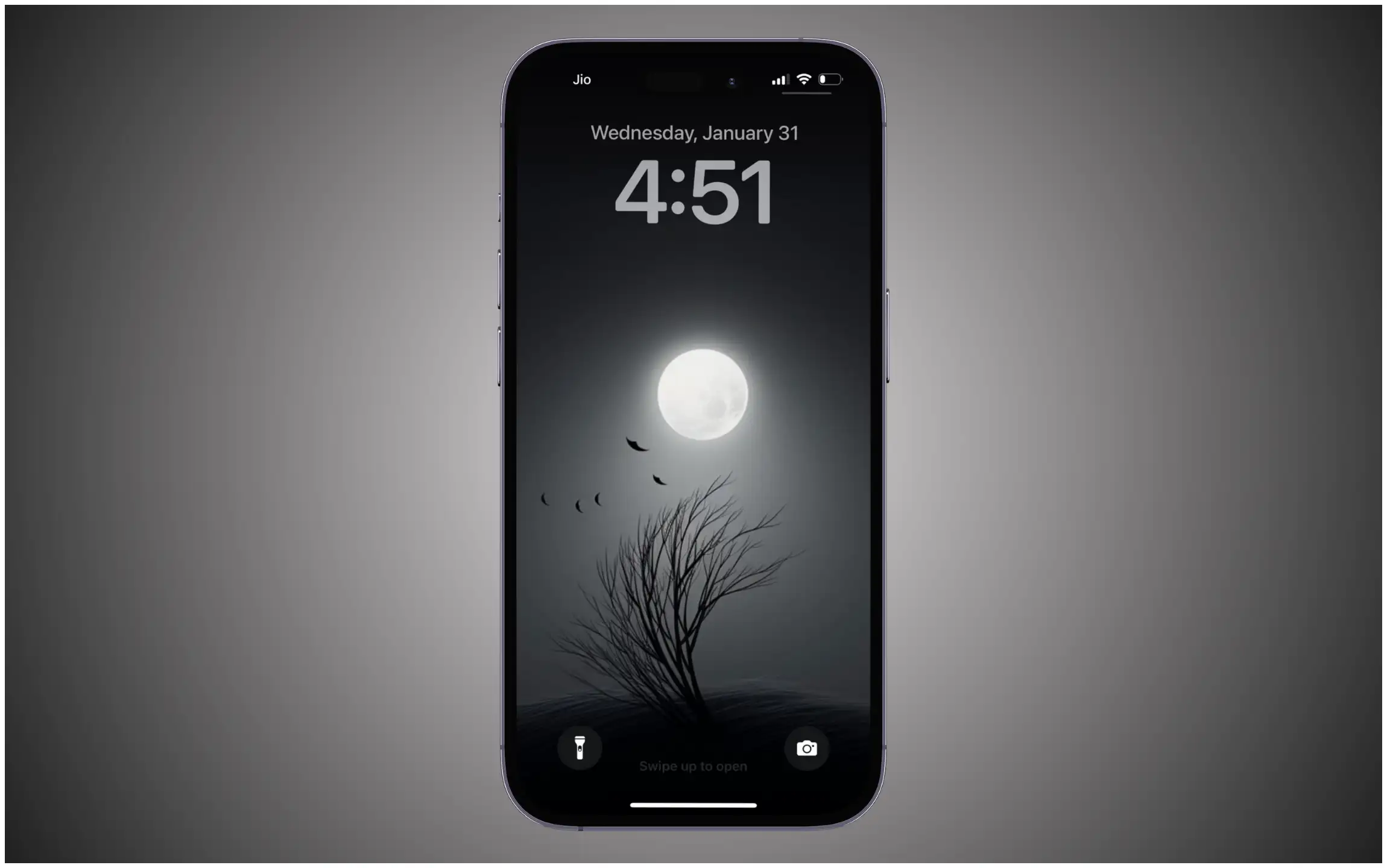 Adorn your screen with mystique through a black and white moon wallpaper, where a silhouette of a barren tree against the night sky, accompanied by birds, creates a captivating nocturnal scene.