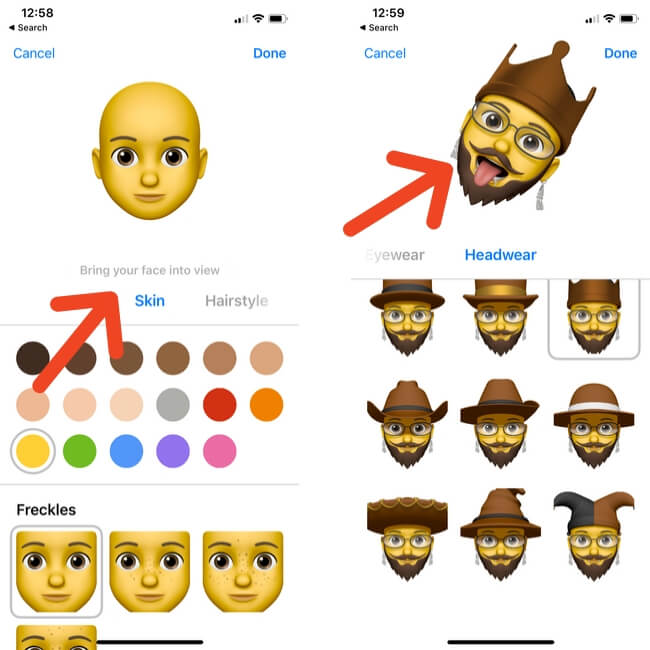 - Now you will see dozens of options available which allows you to create a unique Memoji and express your feelings. Features like you can add freckles and select from a huge range of skin tones and hair colors. Besides this, customize your eyebrows, ears, lips, shape of head, nose and more. Everything that I mentioned above comes under the category of physical traits. Now we will see how to dress up and make Memoji more beautiful.