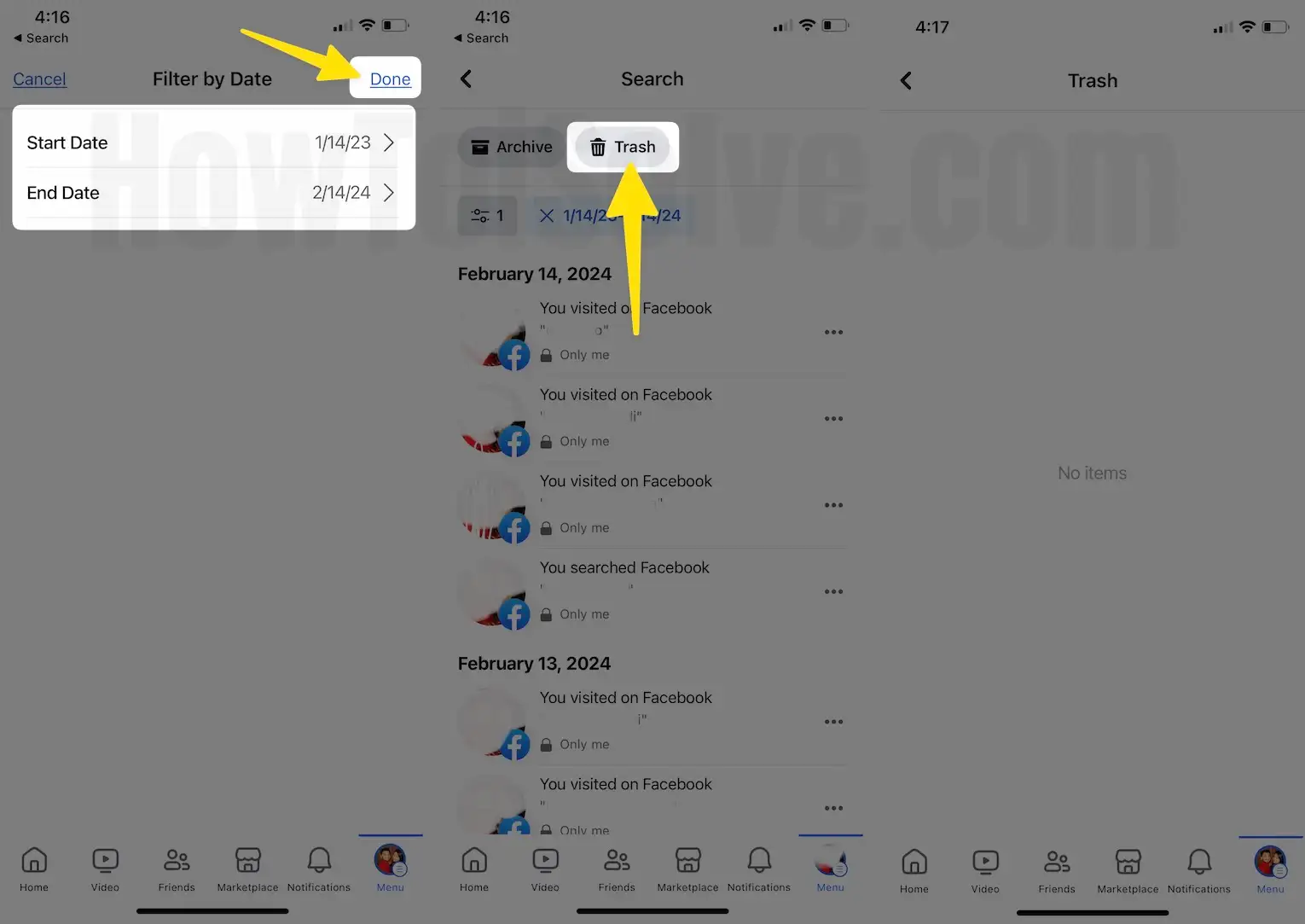 - Learn how to filter your Facebook activity log by date and categories on your Facebook mobile app. Go to Facebook account settings on iPhone > Activity log > Logged Information > Filter > Date > View & Trash.