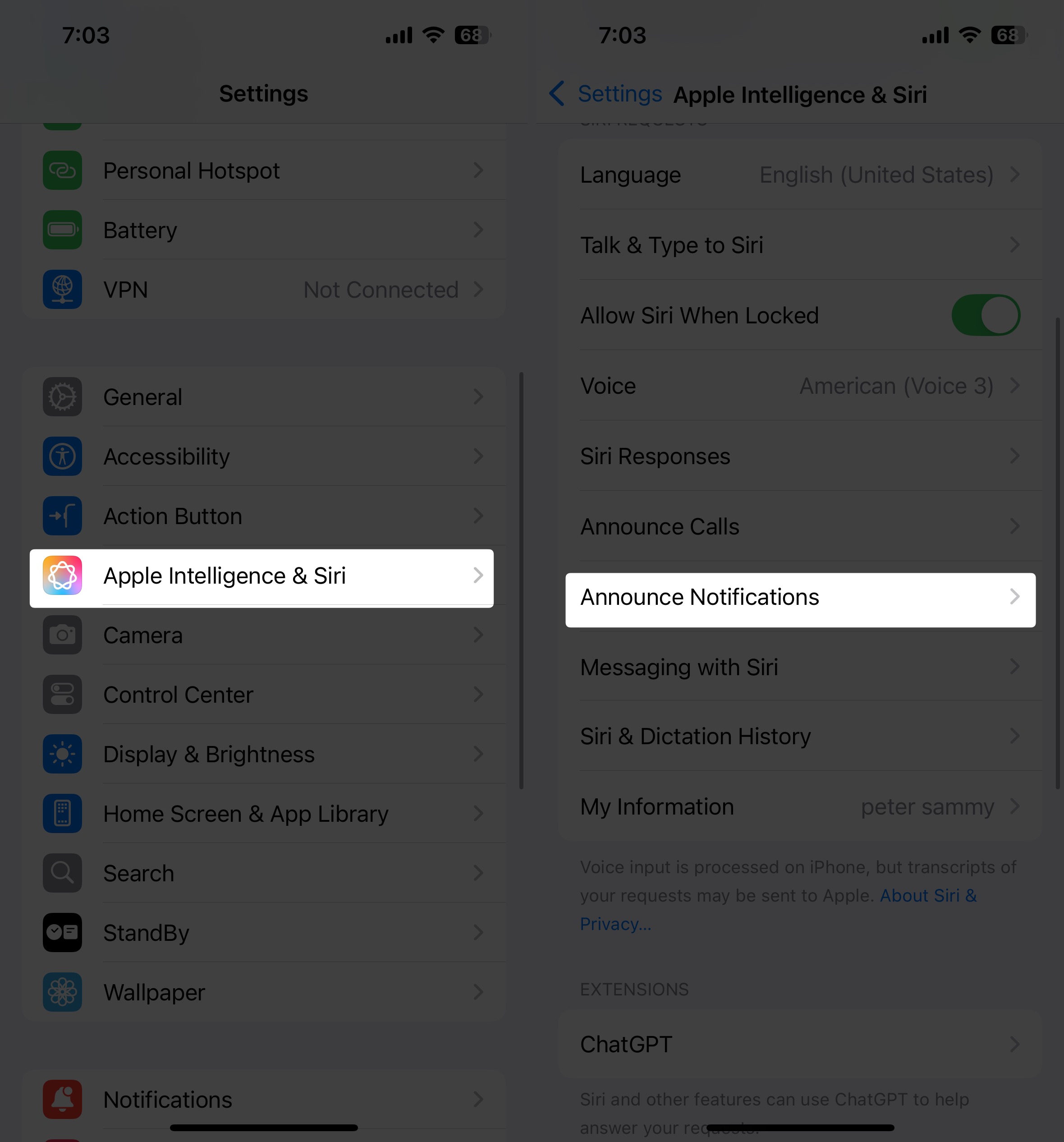 - Scroll to Apple intelligence & Siri (Siri & Search).