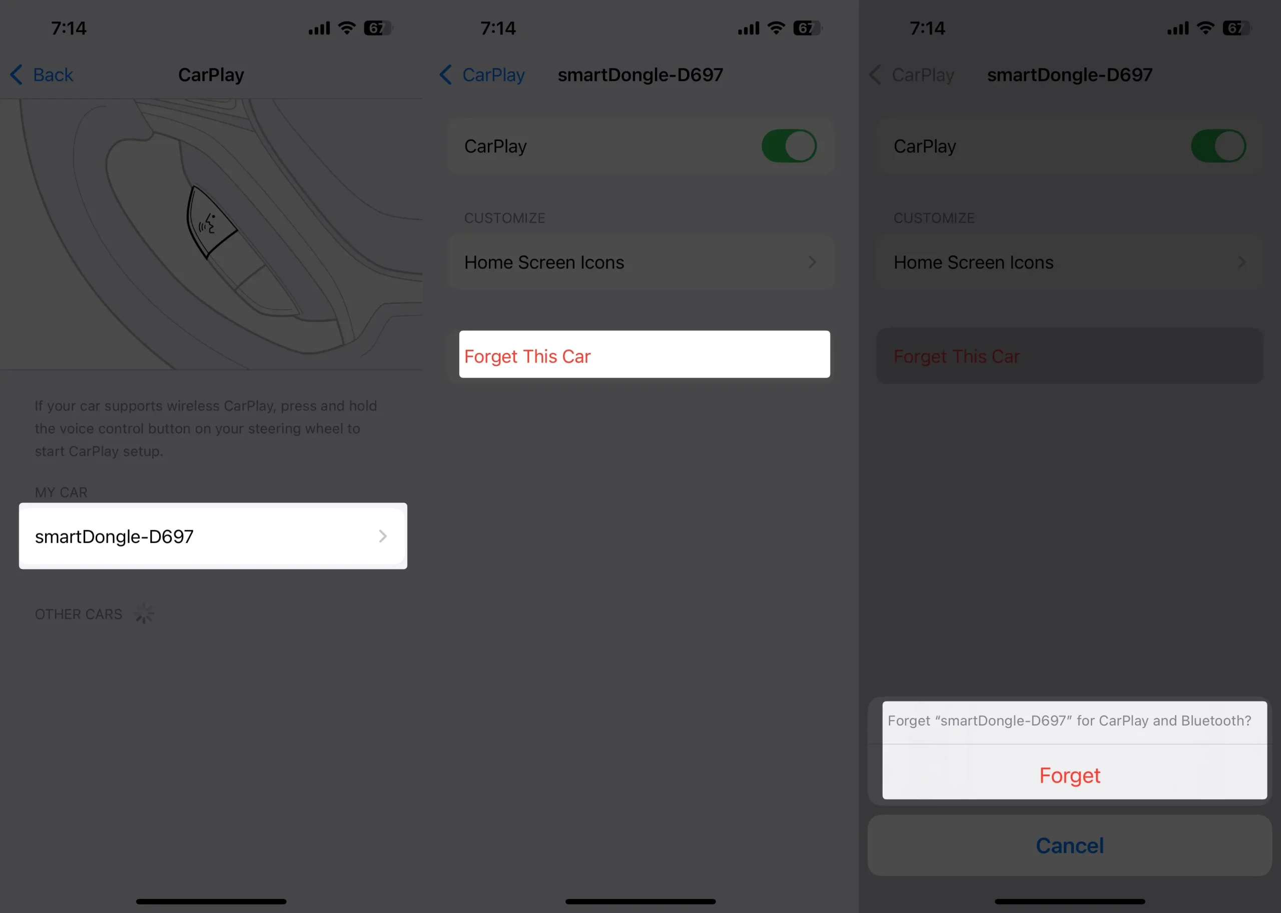 - Tap on Forget This Car. Then, wait a few seconds and repair your car via USB cable or Bluetooth.