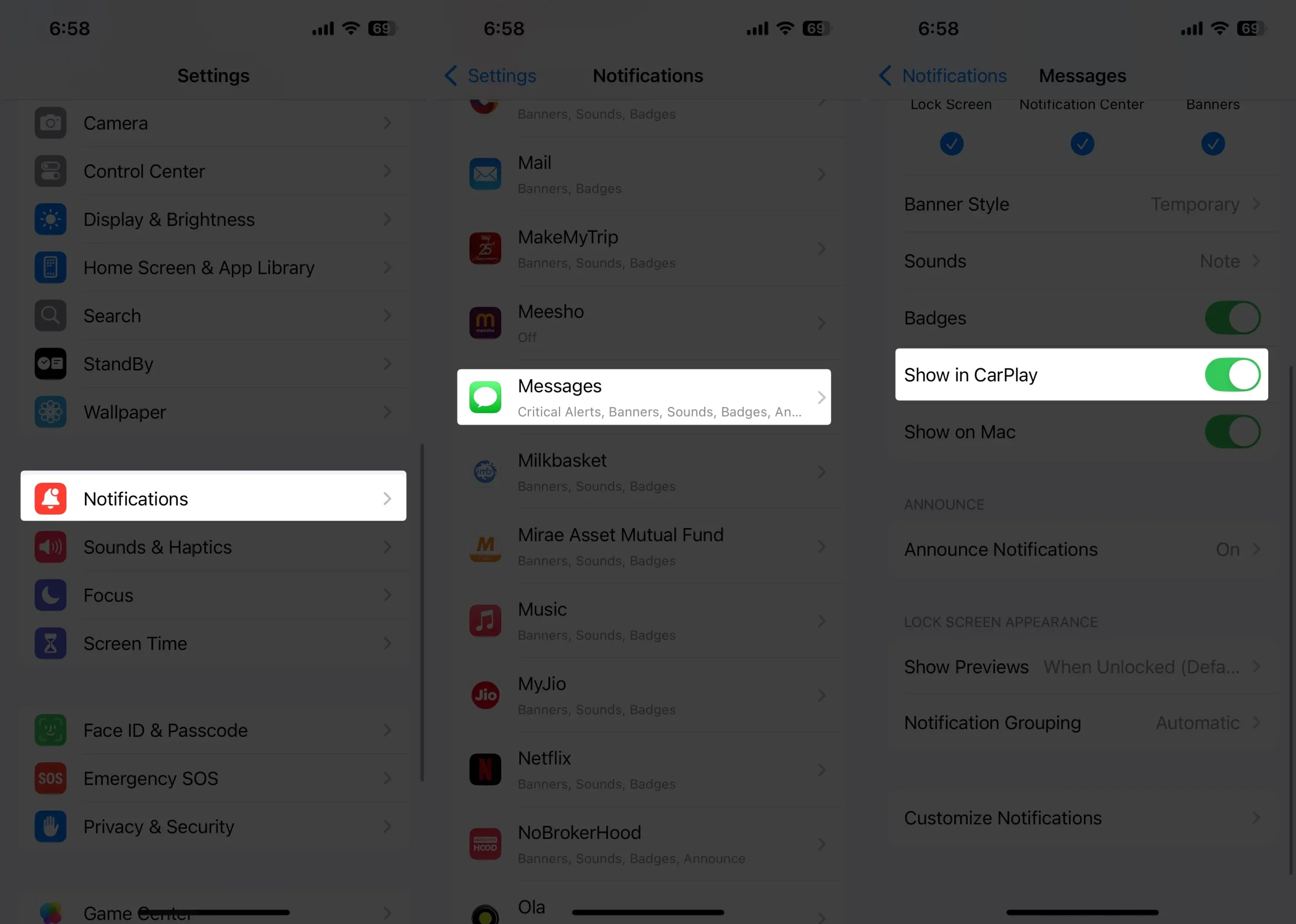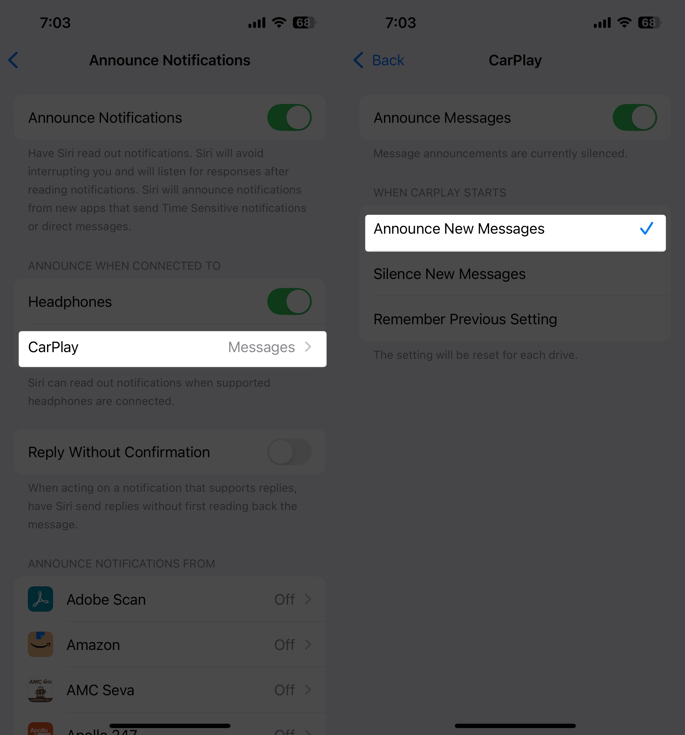 If you keep receiving notifications on the screen but your car isn’t reading messages, turn on the announce notifications feature from the Siri Settings on your iPhone running the latest iOS.