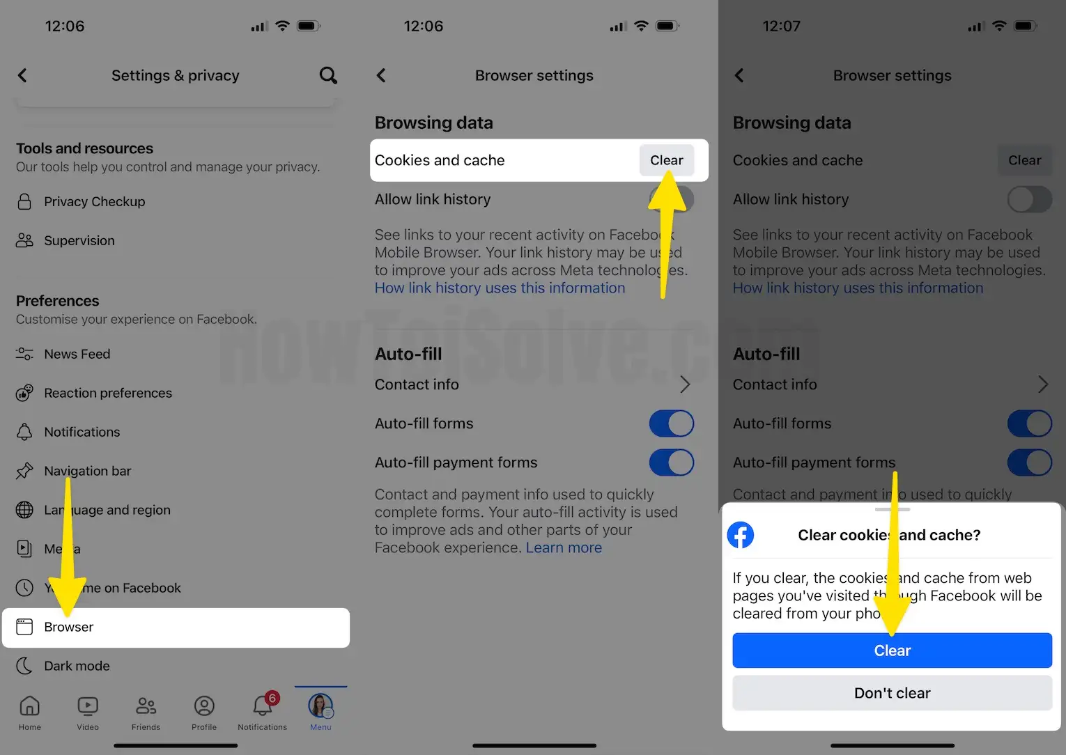 Step 3: Select Browser > Tap on Clear next to the Cookies & Cache under the Browsing Data > Click on Clear Cookies and Cache for Confirmation.