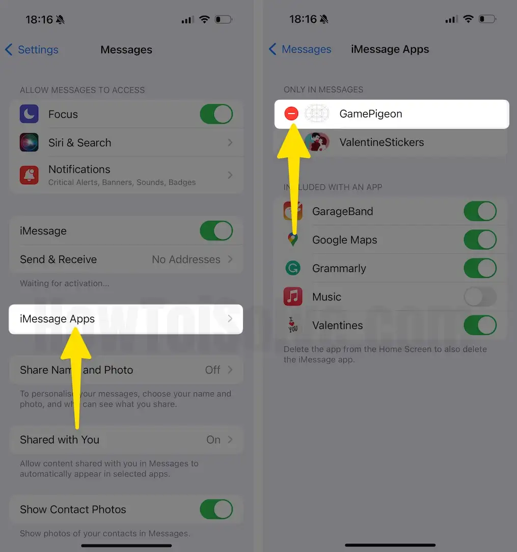 Step 2: On the next screen, tap on iMessage App. Select – Minus Icon next to the problematic app.