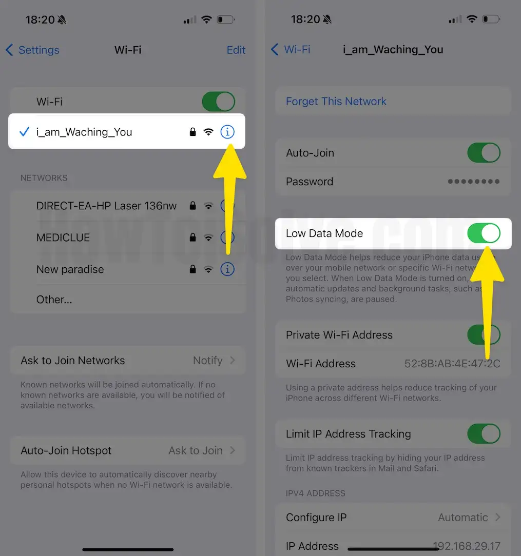 Step 2: Tap the i Info Icon next to the connected Wi-Fi name. Now, scroll down and hit the toggle next to the Low Data Mode to deactivate it.
