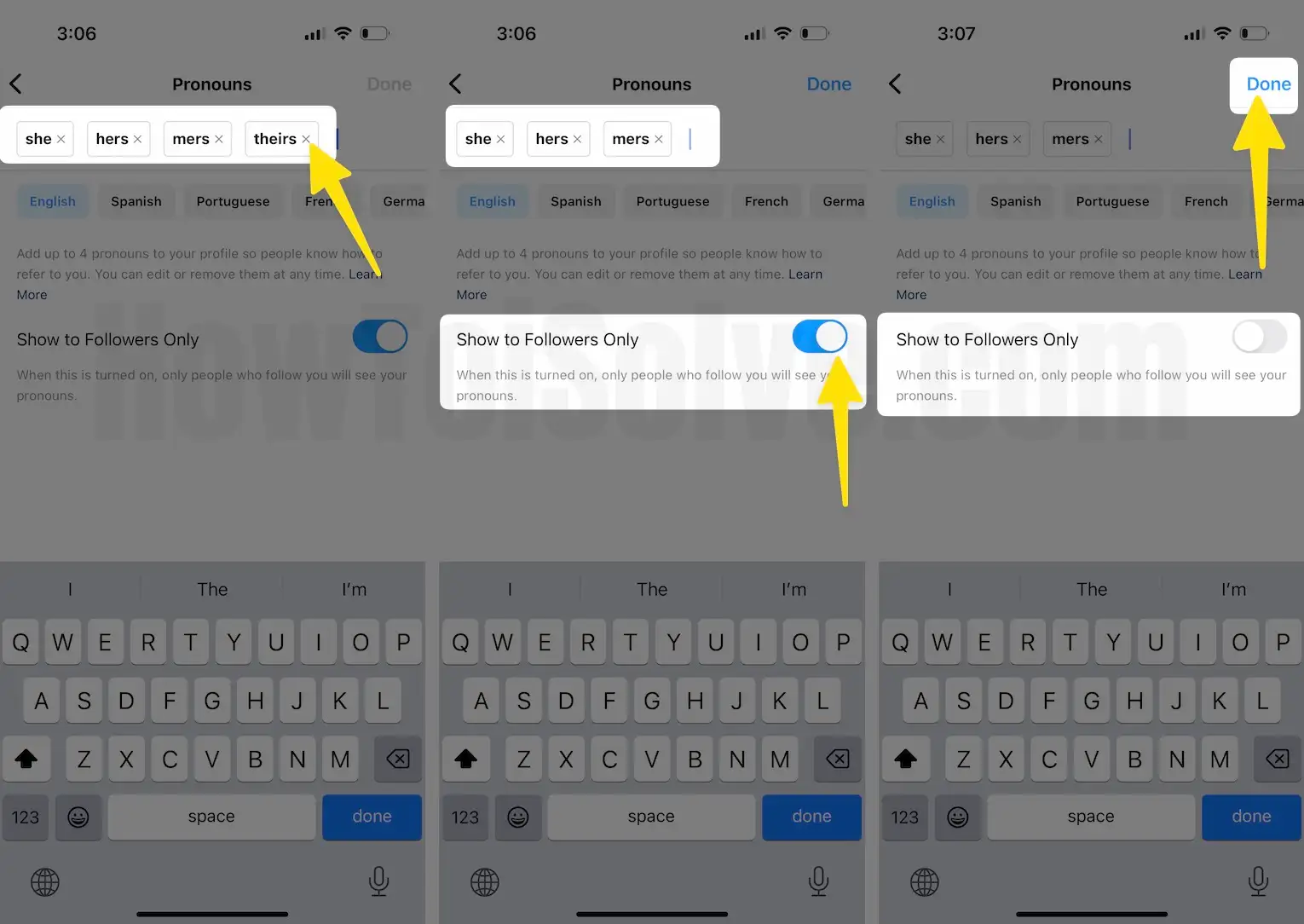 - Add & review Pronouns. You should see the Show to Followers Only switch. Toggle the button accordingly.