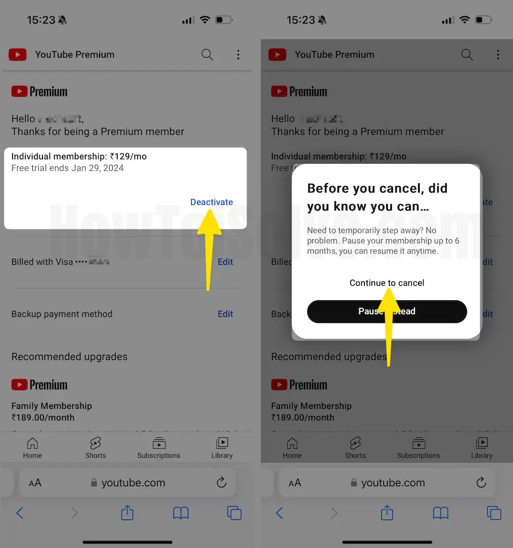 Step 2: Tap on Deactivate > Select Continue to Cancel Options to Cancel YouTube Premium successfully from your account without the desktop.