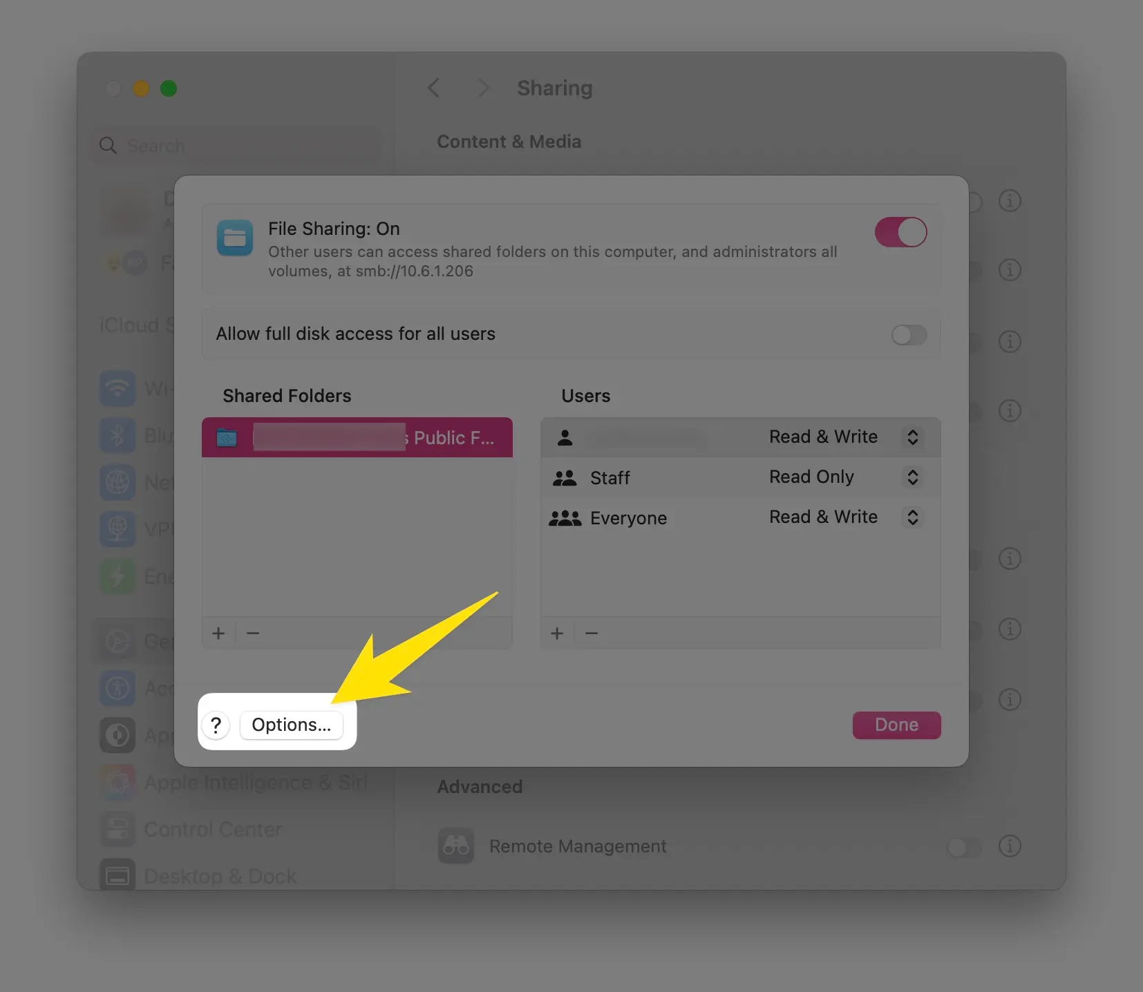 - ✅ Select the user accounts that can share files. If you select the checkbox next to the account name, a pop-up will appear prompting you to enable file sharing using SMB for “User Name”, enter the password for that account. Next, click on OK. in last, go with Done button.
