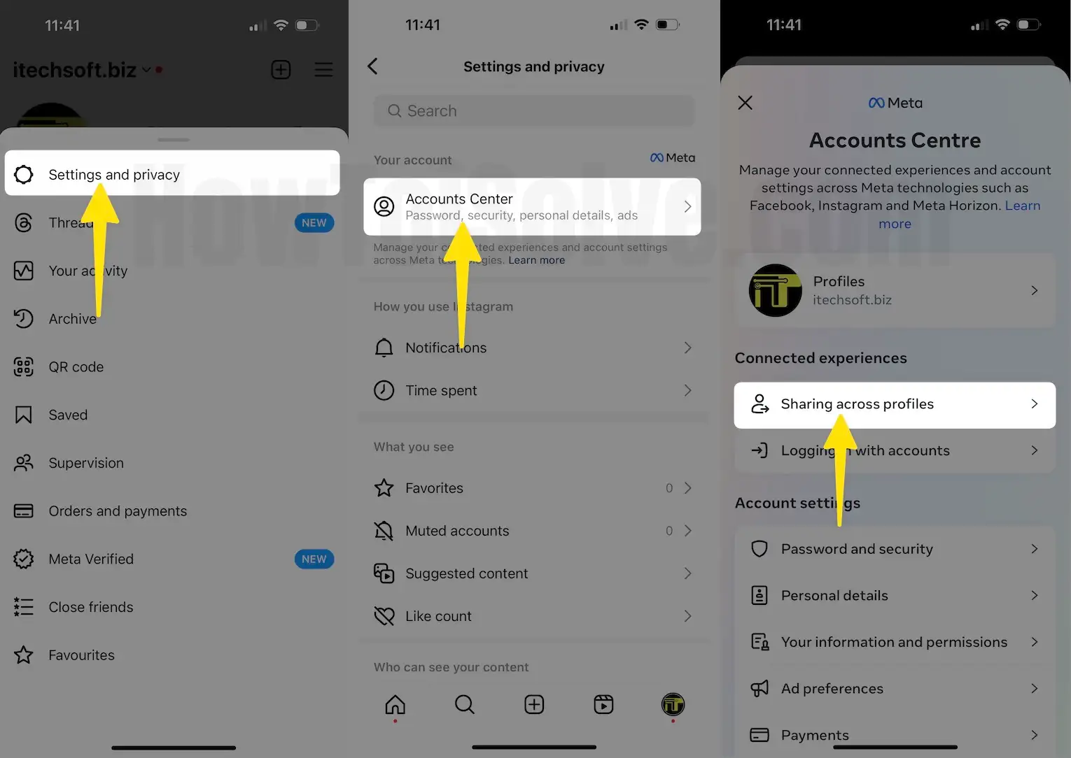 2. Select Settings and Privacy, tap on Accounts Center then choose Sharing across profiles.