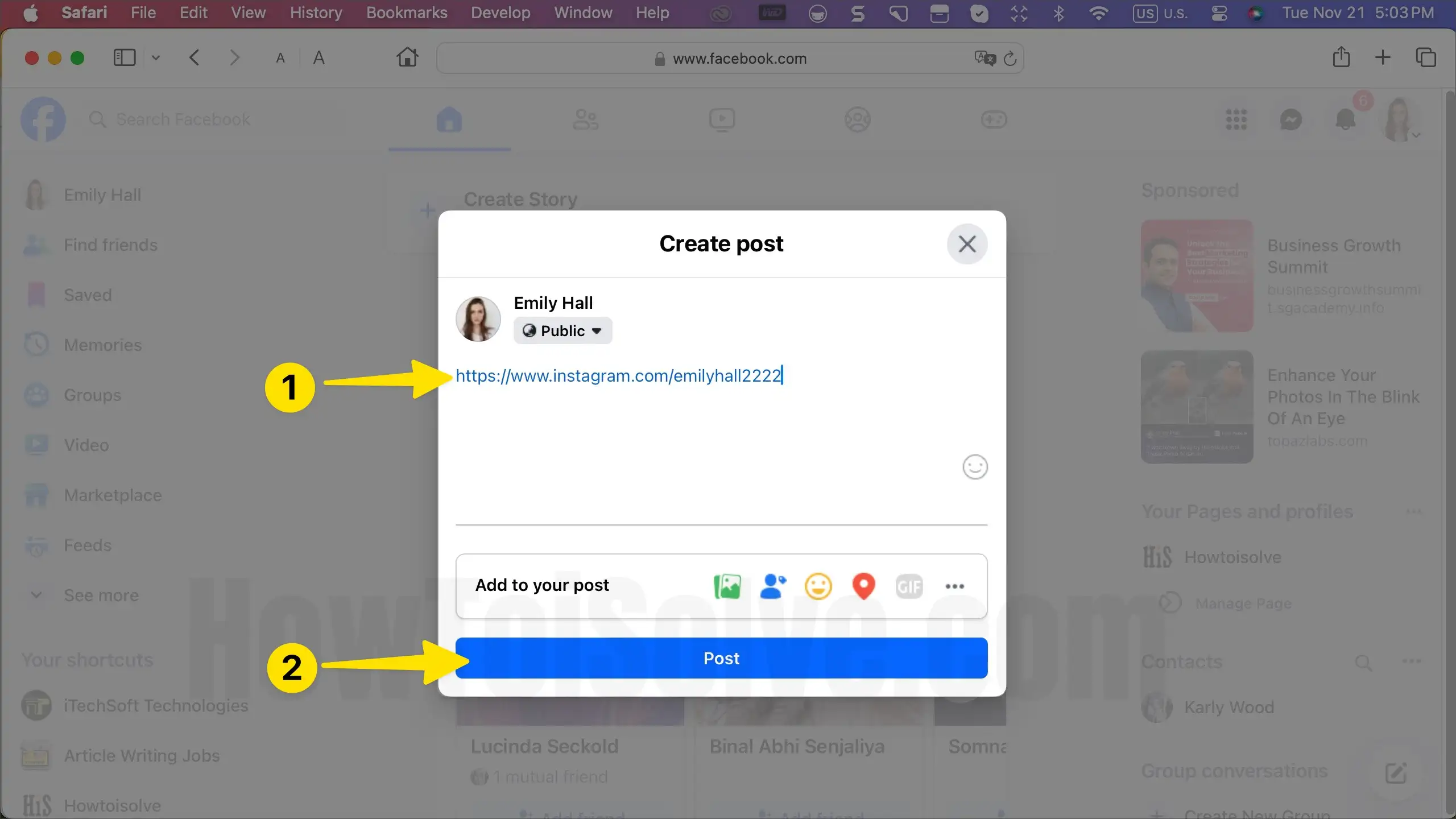 1. Next, open your Facebook account. Create a Post from the What’s on your mind, your name? Section; write a few words if you want and paste the Instagram Profile link.