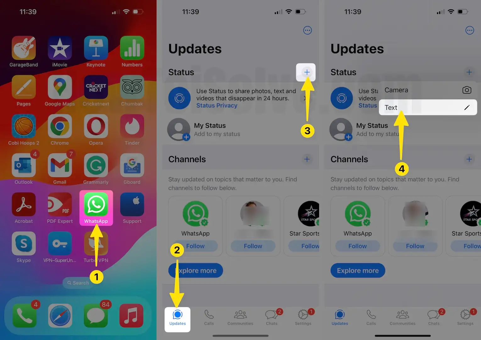 4. Launch WhatsApp next, tap on Updates, click on (+) Plus ICon select the Text option on iPhone.