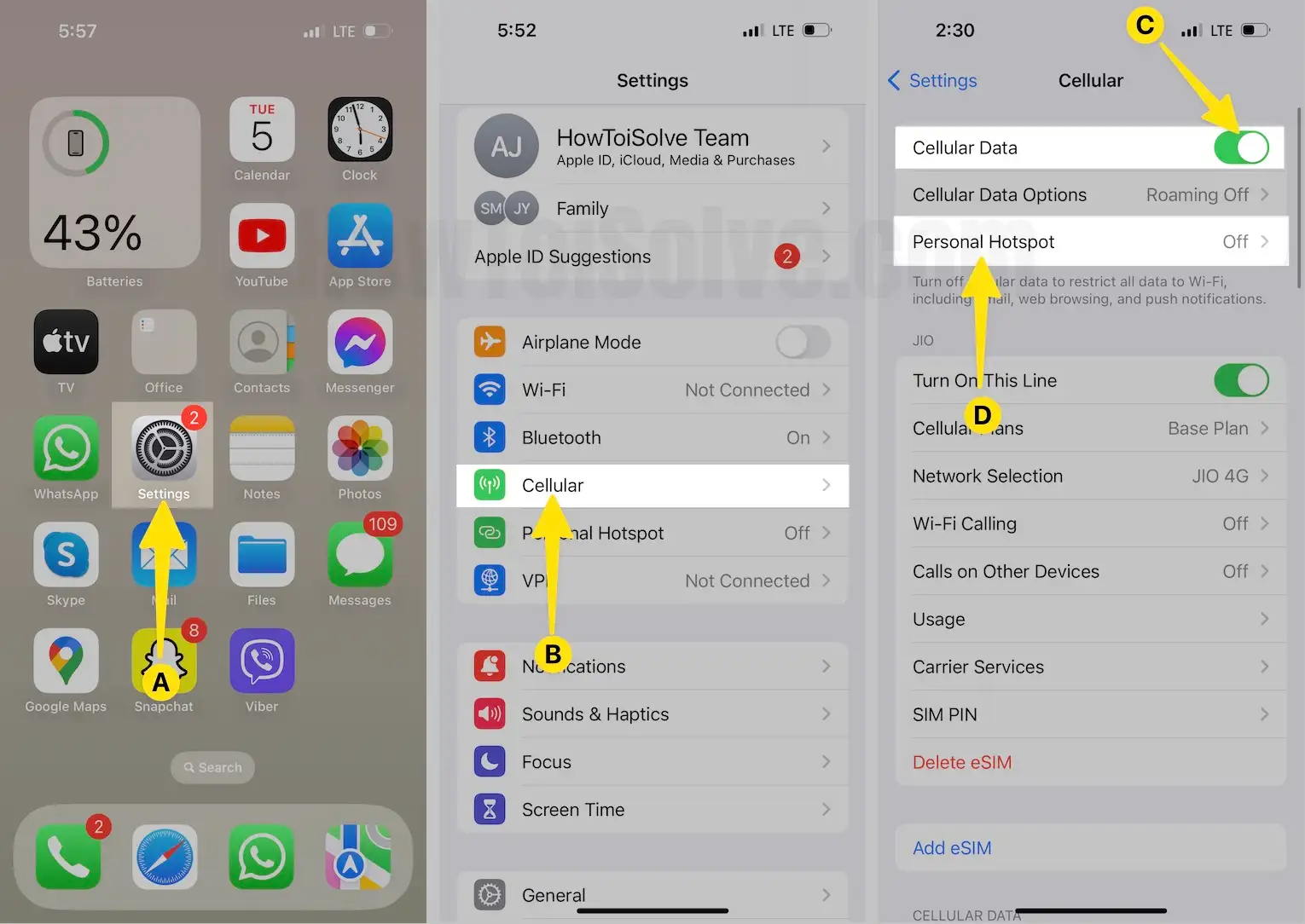 - Enable Cellular Data. Next, Tap on Personal Hotspot.