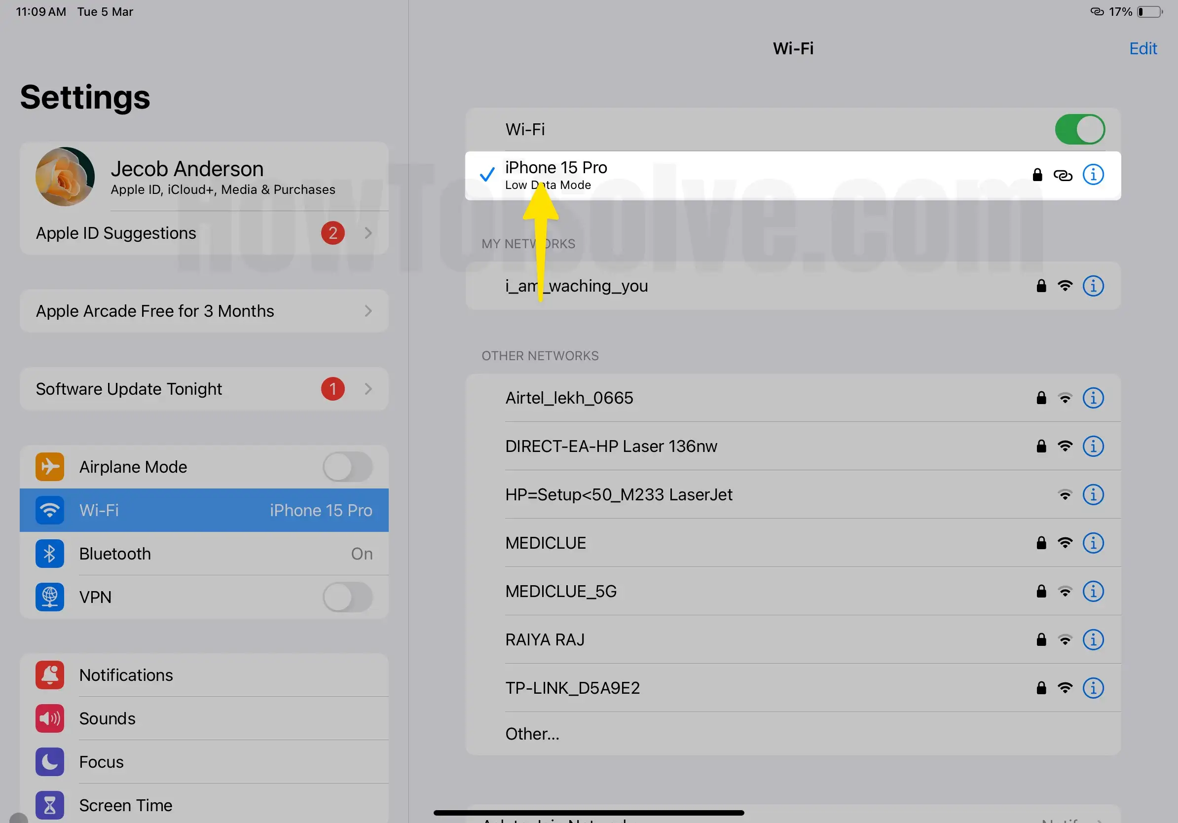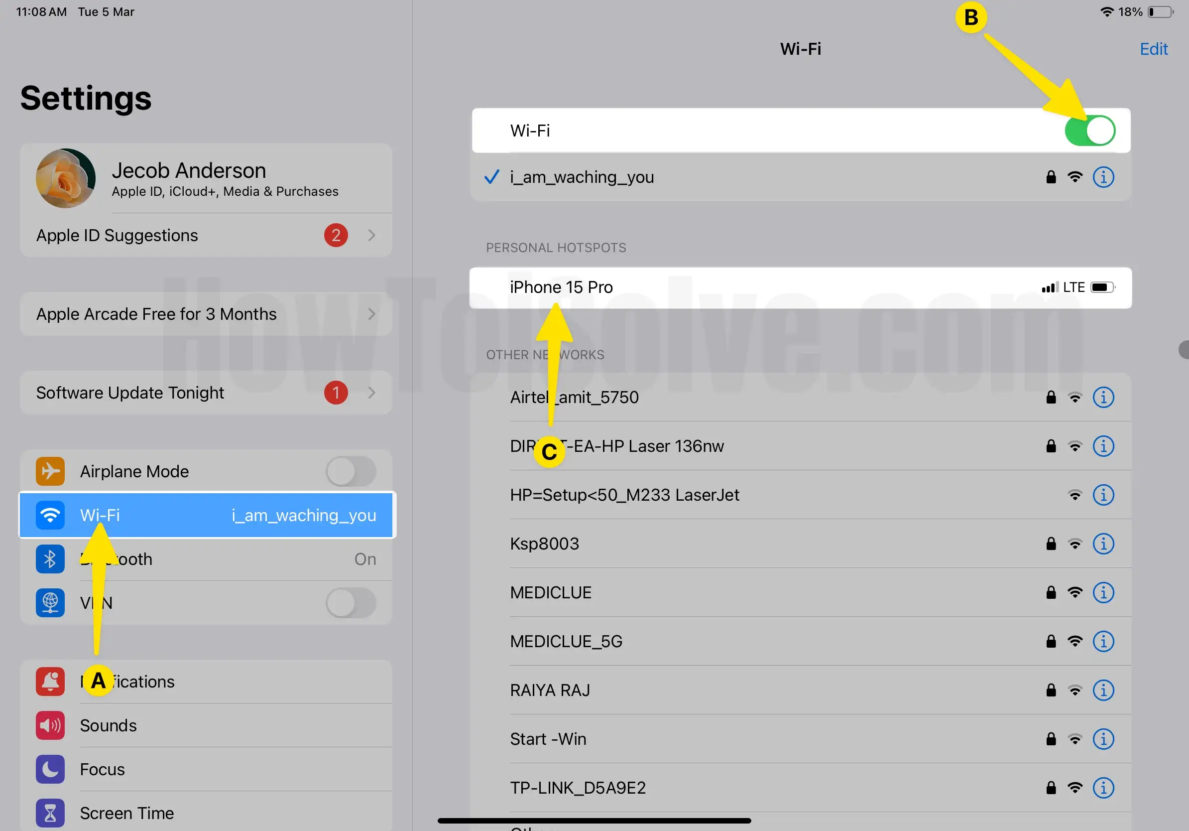 - Tap on Wi-Fi at the Left Pane. Next, Enable Wi-Fi From the Right Pane. Wait for a Few Seconds, Your Parental Device will show under Network, and Tap on it.