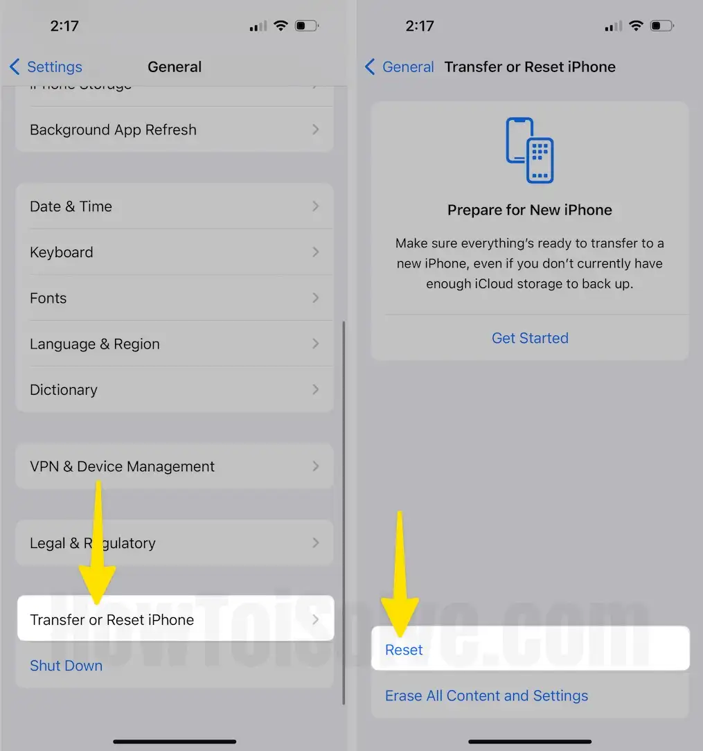- Scroll the Screen to Tap on Transfer or Reset iPhone.