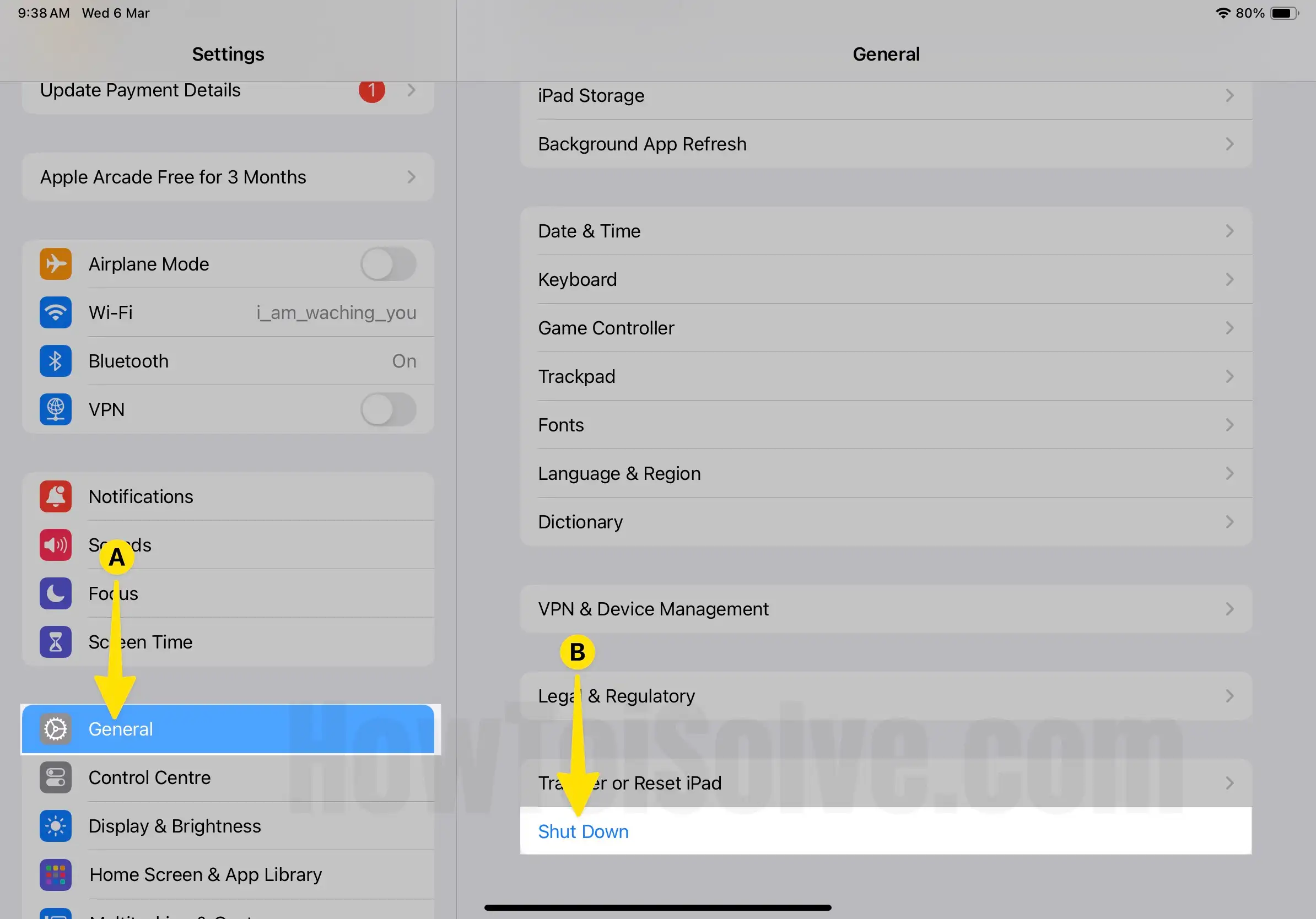 - Launch the Settings App on your iPad. Next, Tap on General at the Left Pane. Select Shut Down From the Bottom of the Right Pane.