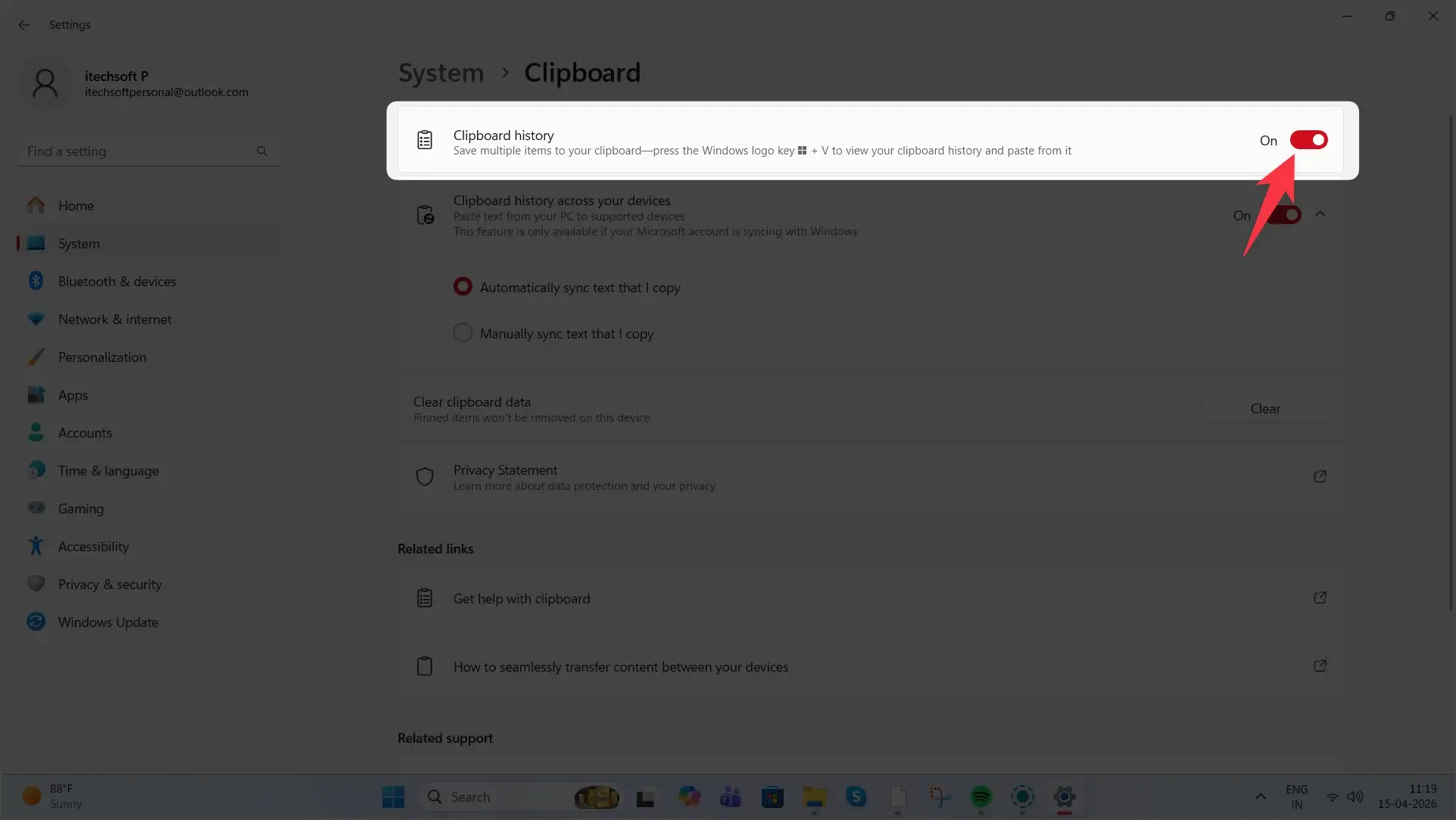 - Alternatively, you can enable Clipboard history through Settings by toggling it on under System > Clipboard.