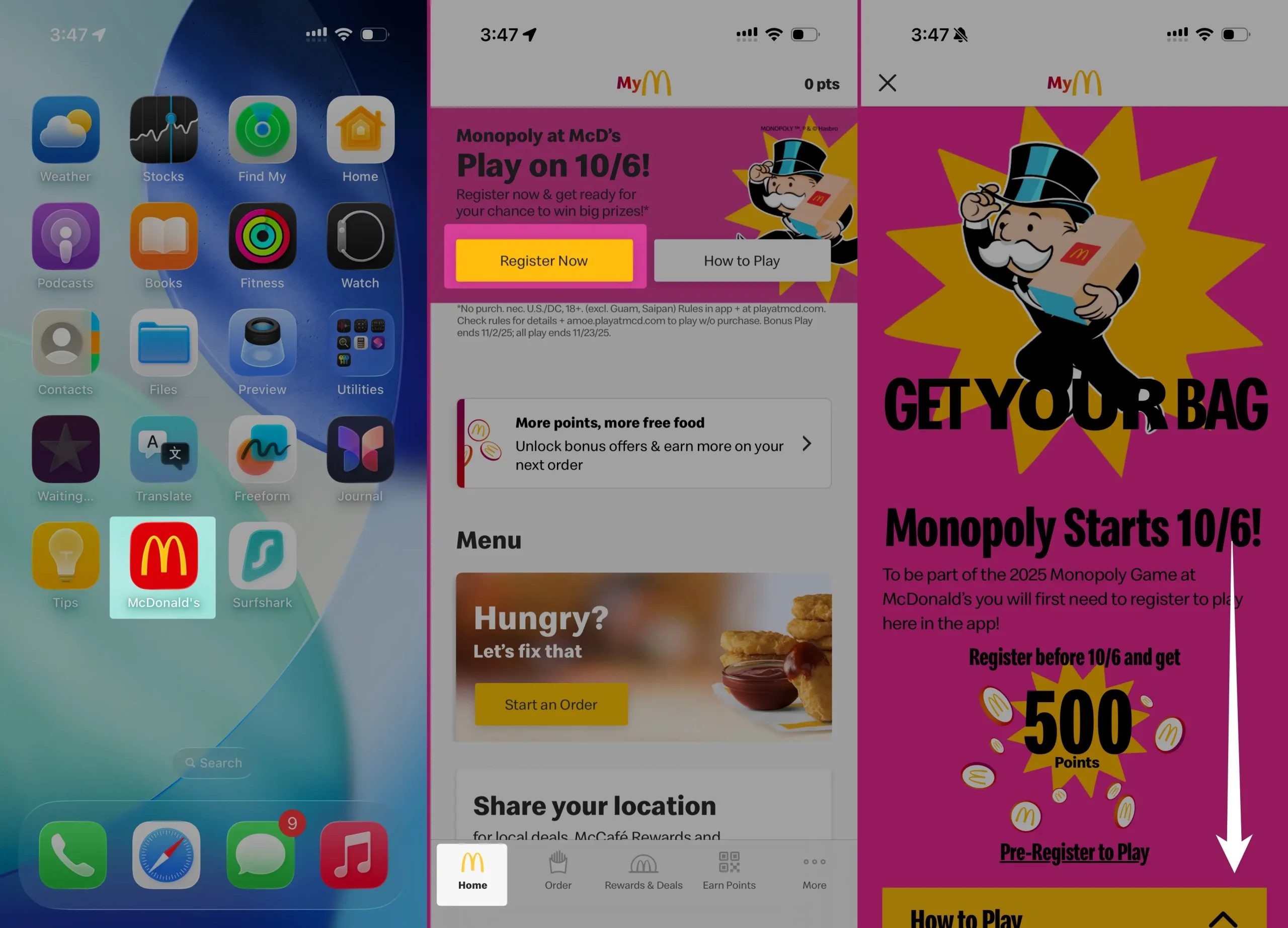 - Prior to the official start date, McDonald’s will often display a “Register for Monopoly” banner or section in the app.