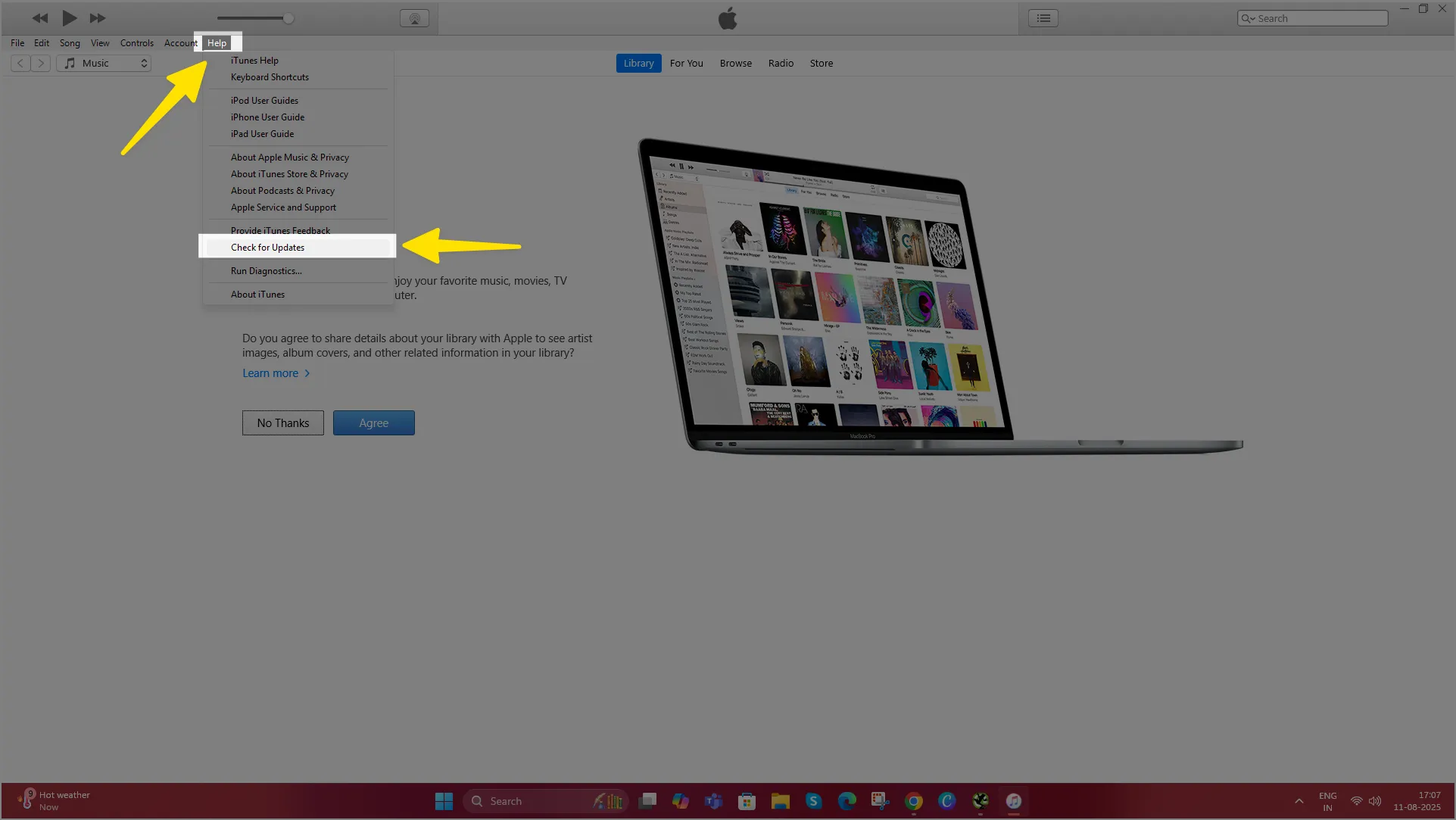 If you installed iTunes from the Microsoft Store, it updates automatically. However, you can check for updates manually: