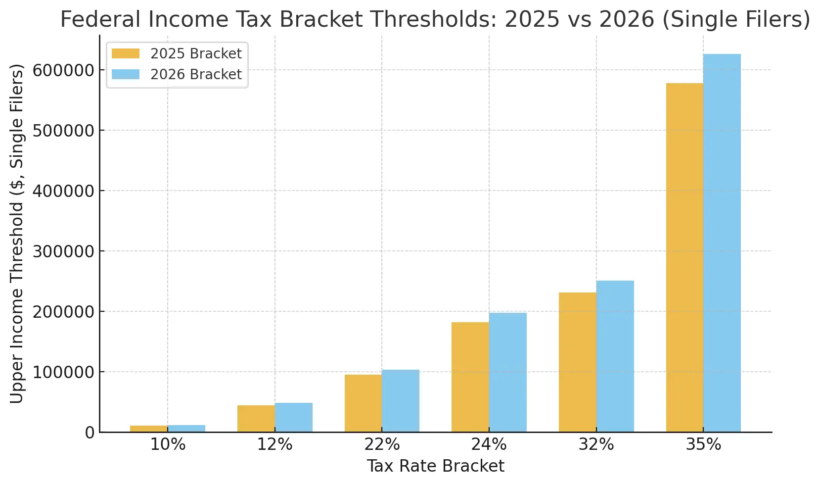 “Bar chart comparing IRS 2025 and 2026 tax bracket upper limits by percentage for single filers.”