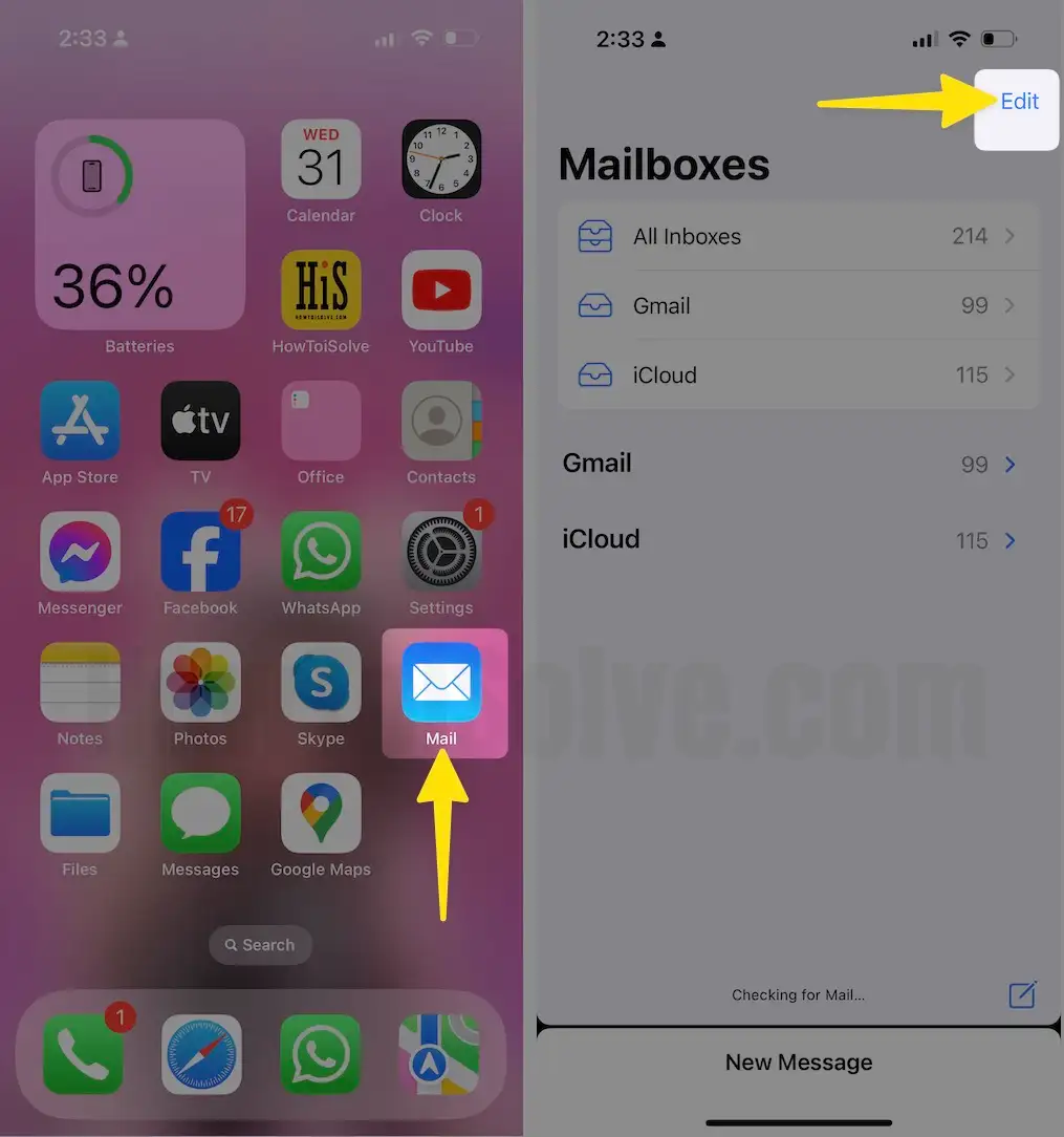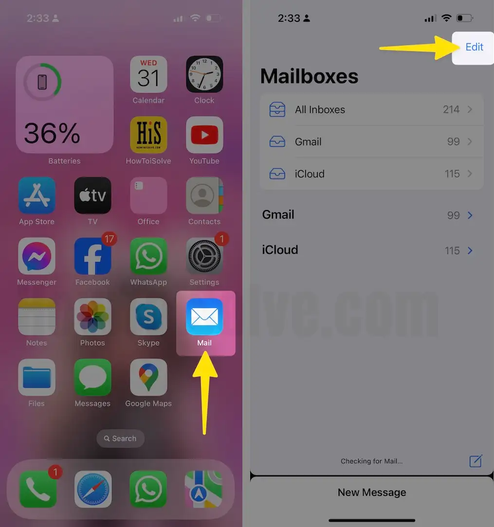 Step 1: Launch the Mail App on your iPhone > Tap on the Edit Option From the top Right Corner of the Screen.