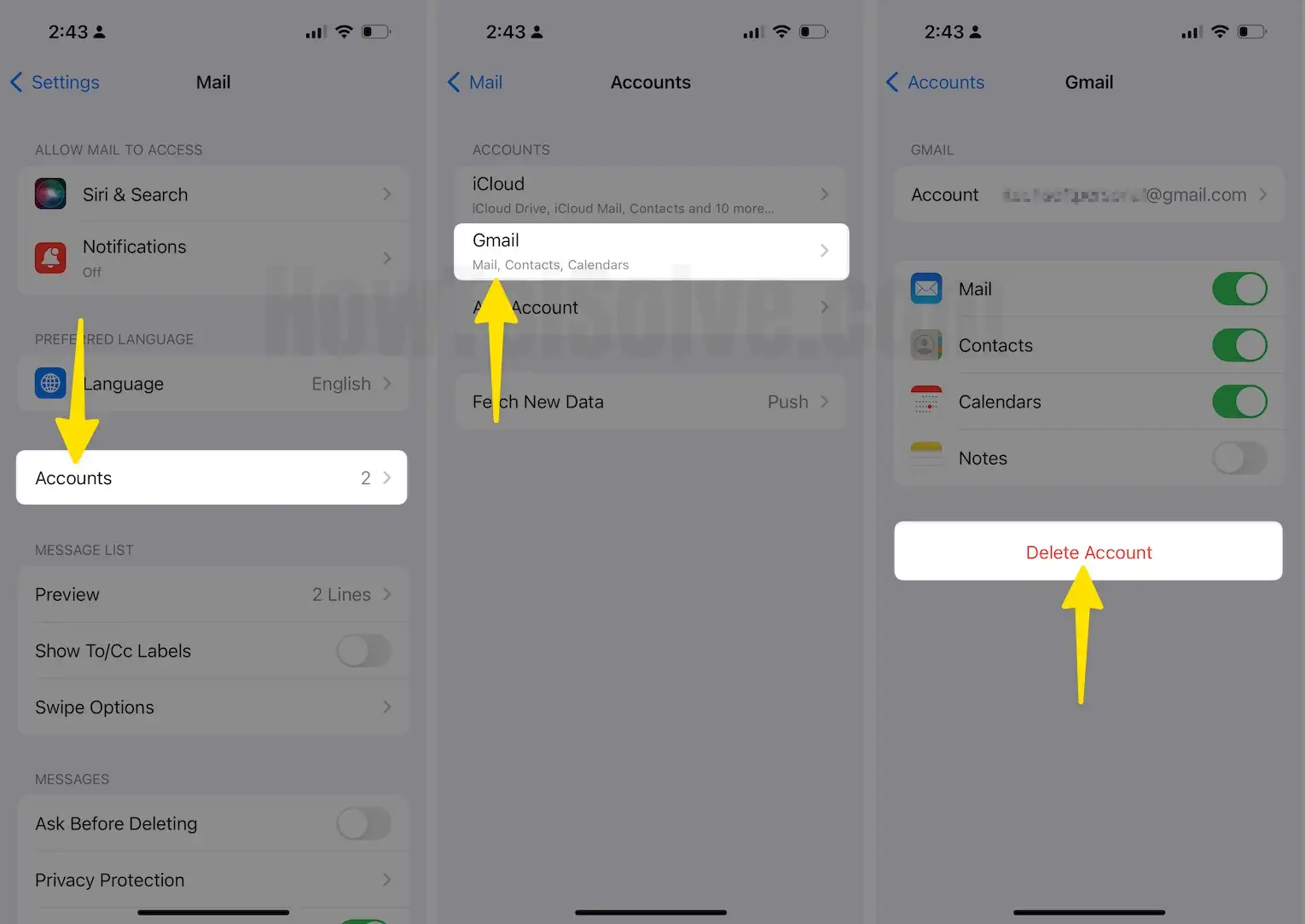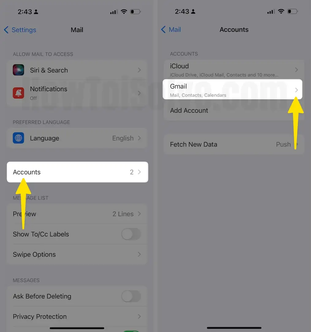 Step 2: Tap on Accounts Section > See the List of all Mail accounts, Select Email Account > Tap on Delete Account.